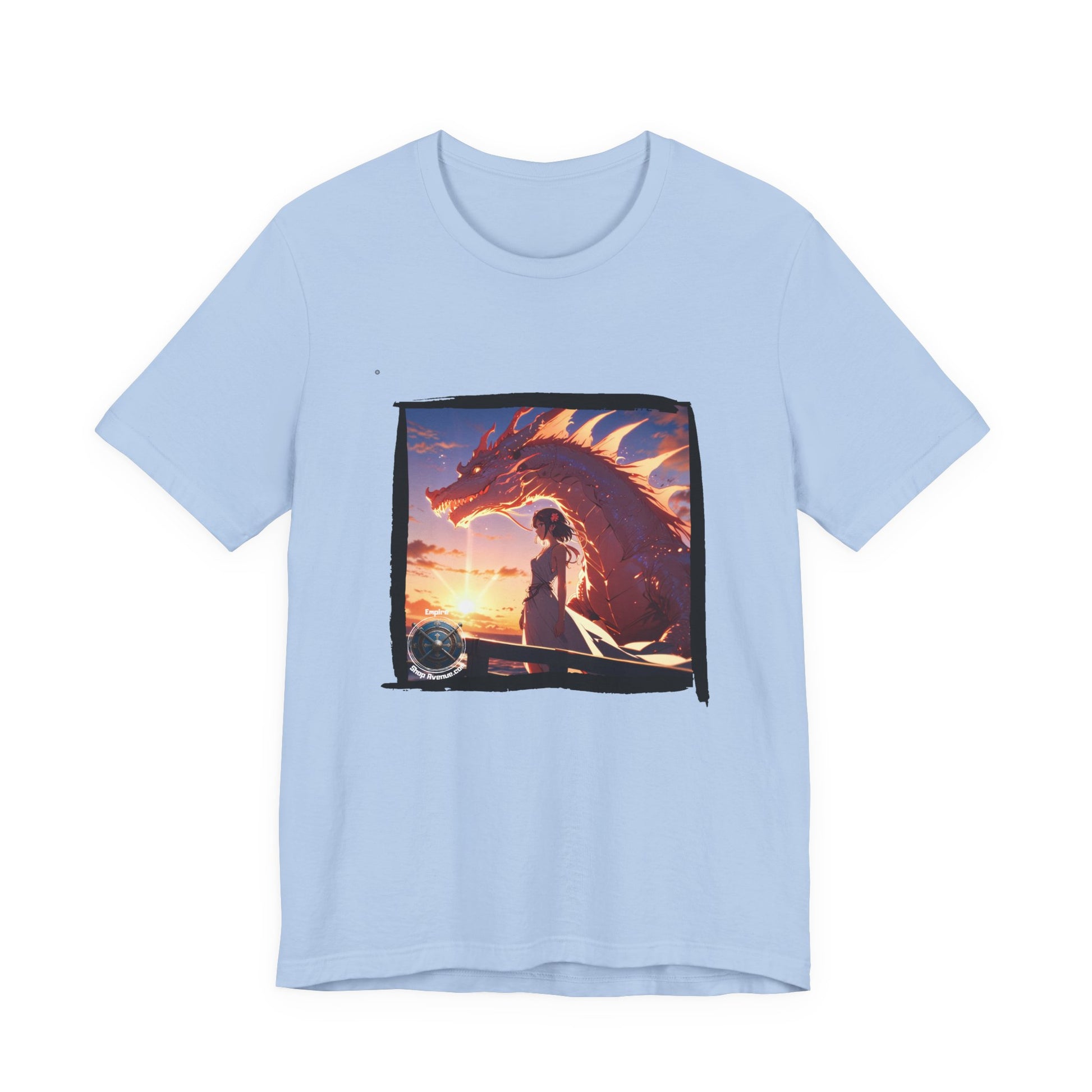 A lightweight, artist-driven tee that brings a cinematic fantasy scene to your everyday wardrobe. The soft, breathable cotton sits easy against the skin while the vivid front print captures a sunset tableau: a lone figure and a towering dragon framed in painterly strokes. Wear it layered under a jacket for city nights or alone when you want the art to speak. The retail crew neckline and clean side seams keep the silhouette tidy; a tear-away neck label keeps comfort uninterrupted. Sustainably made and responsibly produced, this tee blends wearable comfort with storytelling artwork you’ll reach for again and again.